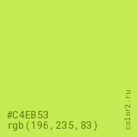Цвет #C4EB53 в цветовой модели RGB обозначается тремя октетами (196, 235, 83) в десятичном формате и #C4EB53 в шестнадцатиричном (hex) формате, которые являются интенсивностью красного 196 (hex C4), интенсивность зелёного 235 (hex EB) и интенсивность синего 83 (hex 53).