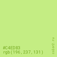 Цвет #C4ED83 в цветовой модели RGB обозначается тремя октетами (196, 237, 131) в десятичном формате и #C4ED83 в шестнадцатиричном (hex) формате, которые являются интенсивностью красного 196 (hex C4), интенсивность зелёного 237 (hex ED) и интенсивность синего 131 (hex 83).