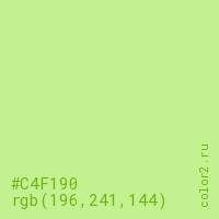 Цвет #C4F190 в цветовой модели RGB обозначается тремя октетами (196, 241, 144) в десятичном формате и #C4F190 в шестнадцатиричном (hex) формате, которые являются интенсивностью красного 196 (hex C4), интенсивность зелёного 241 (hex F1) и интенсивность синего 144 (hex 90).