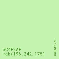 Цвет #C4F2AF в цветовой модели RGB обозначается тремя октетами (196, 242, 175) в десятичном формате и #C4F2AF в шестнадцатиричном (hex) формате, которые являются интенсивностью красного 196 (hex C4), интенсивность зелёного 242 (hex F2) и интенсивность синего 175 (hex AF).
