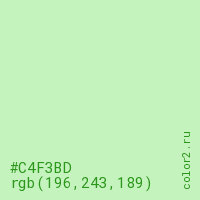 Цвет #C4F3BD в цветовой модели RGB обозначается тремя октетами (196, 243, 189) в десятичном формате и #C4F3BD в шестнадцатиричном (hex) формате, которые являются интенсивностью красного 196 (hex C4), интенсивность зелёного 243 (hex F3) и интенсивность синего 189 (hex BD).