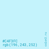 Цвет #C4F3FC в цветовой модели RGB обозначается тремя октетами (196, 243, 252) в десятичном формате и #C4F3FC в шестнадцатиричном (hex) формате, которые являются интенсивностью красного 196 (hex C4), интенсивность зелёного 243 (hex F3) и интенсивность синего 252 (hex FC).