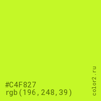 Цвет #C4F827 в цветовой модели RGB обозначается тремя октетами (196, 248, 39) в десятичном формате и #C4F827 в шестнадцатиричном (hex) формате, которые являются интенсивностью красного 196 (hex C4), интенсивность зелёного 248 (hex F8) и интенсивность синего 39 (hex 27).