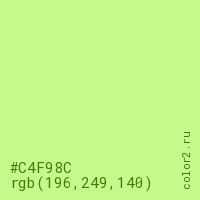 Цвет #C4F98C в цветовой модели RGB обозначается тремя октетами (196, 249, 140) в десятичном формате и #C4F98C в шестнадцатиричном (hex) формате, которые являются интенсивностью красного 196 (hex C4), интенсивность зелёного 249 (hex F9) и интенсивность синего 140 (hex 8C).