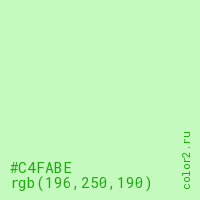 Цвет #C4FABE в цветовой модели RGB обозначается тремя октетами (196, 250, 190) в десятичном формате и #C4FABE в шестнадцатиричном (hex) формате, которые являются интенсивностью красного 196 (hex C4), интенсивность зелёного 250 (hex FA) и интенсивность синего 190 (hex BE).