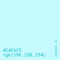 Цвет #C4FAFE в цветовой модели RGB обозначается тремя октетами (196, 250, 254) в десятичном формате и #C4FAFE в шестнадцатиричном (hex) формате, которые являются интенсивностью красного 196 (hex C4), интенсивность зелёного 250 (hex FA) и интенсивность синего 254 (hex FE).
