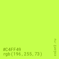 Цвет #C4FF49 в цветовой модели RGB обозначается тремя октетами (196, 255, 73) в десятичном формате и #C4FF49 в шестнадцатиричном (hex) формате, которые являются интенсивностью красного 196 (hex C4), интенсивность зелёного 255 (hex FF) и интенсивность синего 73 (hex 49).