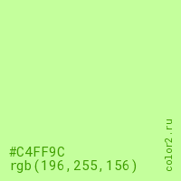 Цвет #C4FF9C в цветовой модели RGB обозначается тремя октетами (196, 255, 156) в десятичном формате и #C4FF9C в шестнадцатиричном (hex) формате, которые являются интенсивностью красного 196 (hex C4), интенсивность зелёного 255 (hex FF) и интенсивность синего 156 (hex 9C).