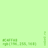 Цвет #C4FFA8 в цветовой модели RGB обозначается тремя октетами (196, 255, 168) в десятичном формате и #C4FFA8 в шестнадцатиричном (hex) формате, которые являются интенсивностью красного 196 (hex C4), интенсивность зелёного 255 (hex FF) и интенсивность синего 168 (hex A8).