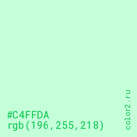 Цвет #C4FFDA в цветовой модели RGB обозначается тремя октетами (196, 255, 218) в десятичном формате и #C4FFDA в шестнадцатиричном (hex) формате, которые являются интенсивностью красного 196 (hex C4), интенсивность зелёного 255 (hex FF) и интенсивность синего 218 (hex DA).