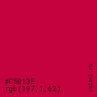 Цвет #C5013E в цветовой модели RGB обозначается тремя октетами (197, 1, 62) в десятичном формате и #C5013E в шестнадцатиричном (hex) формате, которые являются интенсивностью красного 197 (hex C5), интенсивность зелёного 1 (hex 01) и интенсивность синего 62 (hex 3E).
