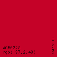 Цвет #C50228 в цветовой модели RGB обозначается тремя октетами (197, 2, 40) в десятичном формате и #C50228 в шестнадцатиричном (hex) формате, которые являются интенсивностью красного 197 (hex C5), интенсивность зелёного 2 (hex 02) и интенсивность синего 40 (hex 28).