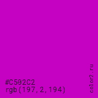Цвет #C502C2 в цветовой модели RGB обозначается тремя октетами (197, 2, 194) в десятичном формате и #C502C2 в шестнадцатиричном (hex) формате, которые являются интенсивностью красного 197 (hex C5), интенсивность зелёного 2 (hex 02) и интенсивность синего 194 (hex C2).