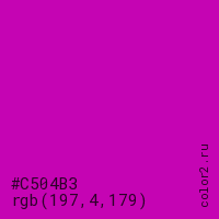 Цвет #C504B3 в цветовой модели RGB обозначается тремя октетами (197, 4, 179) в десятичном формате и #C504B3 в шестнадцатиричном (hex) формате, которые являются интенсивностью красного 197 (hex C5), интенсивность зелёного 4 (hex 04) и интенсивность синего 179 (hex B3).