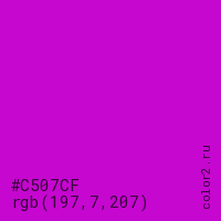 Цвет #C507CF в цветовой модели RGB обозначается тремя октетами (197, 7, 207) в десятичном формате и #C507CF в шестнадцатиричном (hex) формате, которые являются интенсивностью красного 197 (hex C5), интенсивность зелёного 7 (hex 07) и интенсивность синего 207 (hex CF).