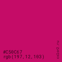 Цвет #C50C67 в цветовой модели RGB обозначается тремя октетами (197, 12, 103) в десятичном формате и #C50C67 в шестнадцатиричном (hex) формате, которые являются интенсивностью красного 197 (hex C5), интенсивность зелёного 12 (hex 0C) и интенсивность синего 103 (hex 67).
