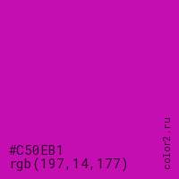 Цвет #C50EB1 в цветовой модели RGB обозначается тремя октетами (197, 14, 177) в десятичном формате и #C50EB1 в шестнадцатиричном (hex) формате, которые являются интенсивностью красного 197 (hex C5), интенсивность зелёного 14 (hex 0E) и интенсивность синего 177 (hex B1).