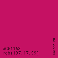 Цвет #C51163 в цветовой модели RGB обозначается тремя октетами (197, 17, 99) в десятичном формате и #C51163 в шестнадцатиричном (hex) формате, которые являются интенсивностью красного 197 (hex C5), интенсивность зелёного 17 (hex 11) и интенсивность синего 99 (hex 63).