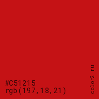 Цвет #C51215 в цветовой модели RGB обозначается тремя октетами (197, 18, 21) в десятичном формате и #C51215 в шестнадцатиричном (hex) формате, которые являются интенсивностью красного 197 (hex C5), интенсивность зелёного 18 (hex 12) и интенсивность синего 21 (hex 15).