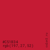 Цвет #C51B34 в цветовой модели RGB обозначается тремя октетами (197, 27, 52) в десятичном формате и #C51B34 в шестнадцатиричном (hex) формате, которые являются интенсивностью красного 197 (hex C5), интенсивность зелёного 27 (hex 1B) и интенсивность синего 52 (hex 34).