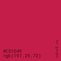 Цвет #C51D49 в цветовой модели RGB обозначается тремя октетами (197, 29, 73) в десятичном формате и #C51D49 в шестнадцатиричном (hex) формате, которые являются интенсивностью красного 197 (hex C5), интенсивность зелёного 29 (hex 1D) и интенсивность синего 73 (hex 49).