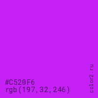 Цвет #C520F6 в цветовой модели RGB обозначается тремя октетами (197, 32, 246) в десятичном формате и #C520F6 в шестнадцатиричном (hex) формате, которые являются интенсивностью красного 197 (hex C5), интенсивность зелёного 32 (hex 20) и интенсивность синего 246 (hex F6).