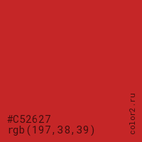 Цвет #C52627 в цветовой модели RGB обозначается тремя октетами (197, 38, 39) в десятичном формате и #C52627 в шестнадцатиричном (hex) формате, которые являются интенсивностью красного 197 (hex C5), интенсивность зелёного 38 (hex 26) и интенсивность синего 39 (hex 27).