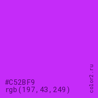 Цвет #C52BF9 в цветовой модели RGB обозначается тремя октетами (197, 43, 249) в десятичном формате и #C52BF9 в шестнадцатиричном (hex) формате, которые являются интенсивностью красного 197 (hex C5), интенсивность зелёного 43 (hex 2B) и интенсивность синего 249 (hex F9).