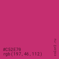 Цвет #C52E70 в цветовой модели RGB обозначается тремя октетами (197, 46, 112) в десятичном формате и #C52E70 в шестнадцатиричном (hex) формате, которые являются интенсивностью красного 197 (hex C5), интенсивность зелёного 46 (hex 2E) и интенсивность синего 112 (hex 70).