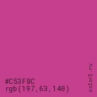 Цвет #C53F8C в цветовой модели RGB обозначается тремя октетами (197, 63, 140) в десятичном формате и #C53F8C в шестнадцатиричном (hex) формате, которые являются интенсивностью красного 197 (hex C5), интенсивность зелёного 63 (hex 3F) и интенсивность синего 140 (hex 8C).