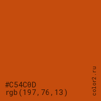 Цвет #C54C0D в цветовой модели RGB обозначается тремя октетами (197, 76, 13) в десятичном формате и #C54C0D в шестнадцатиричном (hex) формате, которые являются интенсивностью красного 197 (hex C5), интенсивность зелёного 76 (hex 4C) и интенсивность синего 13 (hex 0D).