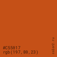 Цвет #C55017 в цветовой модели RGB обозначается тремя октетами (197, 80, 23) в десятичном формате и #C55017 в шестнадцатиричном (hex) формате, которые являются интенсивностью красного 197 (hex C5), интенсивность зелёного 80 (hex 50) и интенсивность синего 23 (hex 17).