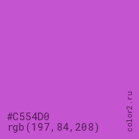 Цвет #C554D0 в цветовой модели RGB обозначается тремя октетами (197, 84, 208) в десятичном формате и #C554D0 в шестнадцатиричном (hex) формате, которые являются интенсивностью красного 197 (hex C5), интенсивность зелёного 84 (hex 54) и интенсивность синего 208 (hex D0).