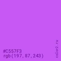 Цвет #C557F3 в цветовой модели RGB обозначается тремя октетами (197, 87, 243) в десятичном формате и #C557F3 в шестнадцатиричном (hex) формате, которые являются интенсивностью красного 197 (hex C5), интенсивность зелёного 87 (hex 57) и интенсивность синего 243 (hex F3).