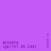 Цвет #C559F8 в цветовой модели RGB обозначается тремя октетами (197, 89, 248) в десятичном формате и #C559F8 в шестнадцатиричном (hex) формате, которые являются интенсивностью красного 197 (hex C5), интенсивность зелёного 89 (hex 59) и интенсивность синего 248 (hex F8).