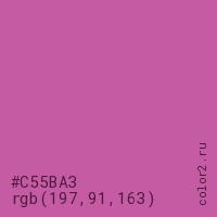 Цвет #C55BA3 в цветовой модели RGB обозначается тремя октетами (197, 91, 163) в десятичном формате и #C55BA3 в шестнадцатиричном (hex) формате, которые являются интенсивностью красного 197 (hex C5), интенсивность зелёного 91 (hex 5B) и интенсивность синего 163 (hex A3).