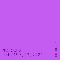 Цвет #C55CF2 в цветовой модели RGB обозначается тремя октетами (197, 92, 242) в десятичном формате и #C55CF2 в шестнадцатиричном (hex) формате, которые являются интенсивностью красного 197 (hex C5), интенсивность зелёного 92 (hex 5C) и интенсивность синего 242 (hex F2).