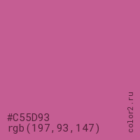 Цвет #C55D93 в цветовой модели RGB обозначается тремя октетами (197, 93, 147) в десятичном формате и #C55D93 в шестнадцатиричном (hex) формате, которые являются интенсивностью красного 197 (hex C5), интенсивность зелёного 93 (hex 5D) и интенсивность синего 147 (hex 93).