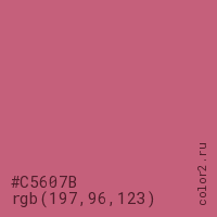Цвет #C5607B в цветовой модели RGB обозначается тремя октетами (197, 96, 123) в десятичном формате и #C5607B в шестнадцатиричном (hex) формате, которые являются интенсивностью красного 197 (hex C5), интенсивность зелёного 96 (hex 60) и интенсивность синего 123 (hex 7B).