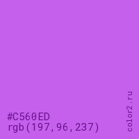 Цвет #C560ED в цветовой модели RGB обозначается тремя октетами (197, 96, 237) в десятичном формате и #C560ED в шестнадцатиричном (hex) формате, которые являются интенсивностью красного 197 (hex C5), интенсивность зелёного 96 (hex 60) и интенсивность синего 237 (hex ED).