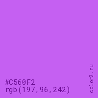 Цвет #C560F2 в цветовой модели RGB обозначается тремя октетами (197, 96, 242) в десятичном формате и #C560F2 в шестнадцатиричном (hex) формате, которые являются интенсивностью красного 197 (hex C5), интенсивность зелёного 96 (hex 60) и интенсивность синего 242 (hex F2).