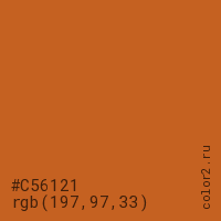 Цвет #C56121 в цветовой модели RGB обозначается тремя октетами (197, 97, 33) в десятичном формате и #C56121 в шестнадцатиричном (hex) формате, которые являются интенсивностью красного 197 (hex C5), интенсивность зелёного 97 (hex 61) и интенсивность синего 33 (hex 21).