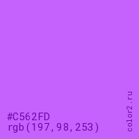 Цвет #C562FD в цветовой модели RGB обозначается тремя октетами (197, 98, 253) в десятичном формате и #C562FD в шестнадцатиричном (hex) формате, которые являются интенсивностью красного 197 (hex C5), интенсивность зелёного 98 (hex 62) и интенсивность синего 253 (hex FD).