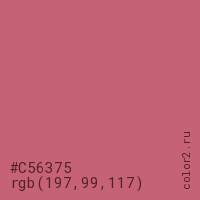 Цвет #C56375 в цветовой модели RGB обозначается тремя октетами (197, 99, 117) в десятичном формате и #C56375 в шестнадцатиричном (hex) формате, которые являются интенсивностью красного 197 (hex C5), интенсивность зелёного 99 (hex 63) и интенсивность синего 117 (hex 75).