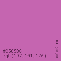 Цвет #C565B0 в цветовой модели RGB обозначается тремя октетами (197, 101, 176) в десятичном формате и #C565B0 в шестнадцатиричном (hex) формате, которые являются интенсивностью красного 197 (hex C5), интенсивность зелёного 101 (hex 65) и интенсивность синего 176 (hex B0).