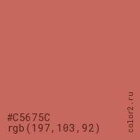 Цвет #C5675C в цветовой модели RGB обозначается тремя октетами (197, 103, 92) в десятичном формате и #C5675C в шестнадцатиричном (hex) формате, которые являются интенсивностью красного 197 (hex C5), интенсивность зелёного 103 (hex 67) и интенсивность синего 92 (hex 5C).