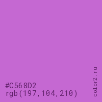 Цвет #C568D2 в цветовой модели RGB обозначается тремя октетами (197, 104, 210) в десятичном формате и #C568D2 в шестнадцатиричном (hex) формате, которые являются интенсивностью красного 197 (hex C5), интенсивность зелёного 104 (hex 68) и интенсивность синего 210 (hex D2).