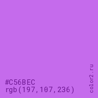Цвет #C56BEC в цветовой модели RGB обозначается тремя октетами (197, 107, 236) в десятичном формате и #C56BEC в шестнадцатиричном (hex) формате, которые являются интенсивностью красного 197 (hex C5), интенсивность зелёного 107 (hex 6B) и интенсивность синего 236 (hex EC).
