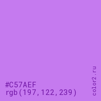 Цвет #C57AEF в цветовой модели RGB обозначается тремя октетами (197, 122, 239) в десятичном формате и #C57AEF в шестнадцатиричном (hex) формате, которые являются интенсивностью красного 197 (hex C5), интенсивность зелёного 122 (hex 7A) и интенсивность синего 239 (hex EF).