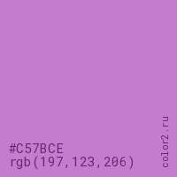 Цвет #C57BCE в цветовой модели RGB обозначается тремя октетами (197, 123, 206) в десятичном формате и #C57BCE в шестнадцатиричном (hex) формате, которые являются интенсивностью красного 197 (hex C5), интенсивность зелёного 123 (hex 7B) и интенсивность синего 206 (hex CE).